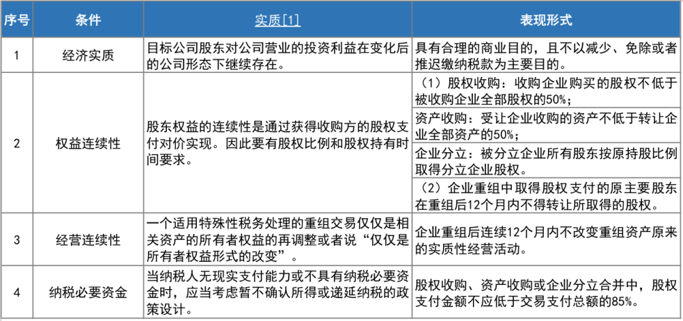 由于企業(yè)重組特殊性稅務(wù)處理/稅收優(yōu)惠的目的在于,由于重組產(chǎn)生的效果是使目標(biāo)公司原股東對(duì)目標(biāo)公司的投資利益以不同形式發(fā)生延續(xù),因此通過納稅時(shí)間的遞延,提高企業(yè)重組的經(jīng)濟(jì)效率,在盤活資產(chǎn)增值潛能后再收回政府讓渡的稅收利益。以企業(yè)重組中的企業(yè)所得稅為例,若要適用特殊性稅務(wù)處理,需同時(shí)滿足以下條件: