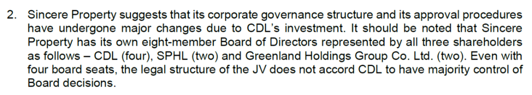 但是CDL對此并不買賬,針對協信遠創的聲明進行反駁,表示其對CDL的指責均為不實,大致意思為協信遠創董事會共有8人,協信和綠地各有2個名額,CDL所占據的4個董事會席位,不會對協信遠創構成控制。