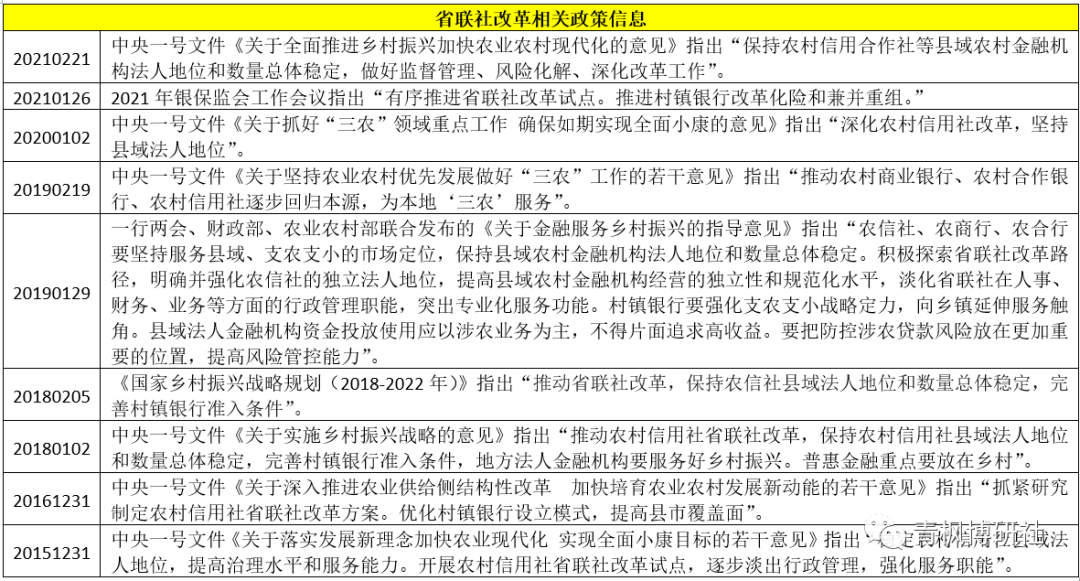 (1)2021年10月21日,銀保監(jiān)會(huì)首席檢查官、辦公廳主任王朝弟在國新辦發(fā)布會(huì)上表示“繼續(xù)深化農(nóng)信社改革已經(jīng)提上日程……把深化省聯(lián)社改革與提高農(nóng)信系統(tǒng)風(fēng)險(xiǎn)防控能力作為重點(diǎn),因地制宜,按照‘一省一策’的原則,支持各小(區(qū))從自身實(shí)際出發(fā),制定切實(shí)可行的農(nóng)信社改革方案……通過改革,能夠切實(shí)讓省聯(lián)社成為一個(gè)產(chǎn)權(quán)清晰、權(quán)責(zé)明確、政企分開、管理規(guī)范的現(xiàn)代化金融企業(yè)”,同時(shí)在該發(fā)布會(huì)上,王朝弟還透露絕大部分省份已經(jīng)上報(bào)了深化農(nóng)信社改革方案,且浙江省的農(nóng)信社改革方案即將落地。