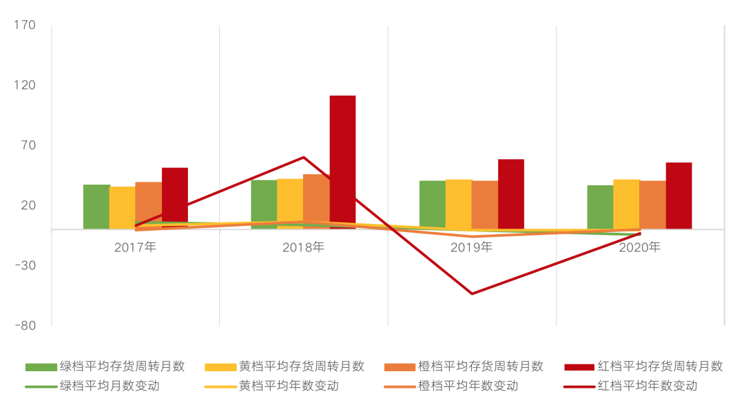 橫向比較來看,2020年紅檔房企的周轉速度最慢,平均存貨周轉月數在55.7個月,綠檔房企周轉速度最快,周轉月數達到了36.3個月。自2019年以來各檔位都在著手去庫存,尤其是紅檔房企下降最多,2020年仍在持續加快周轉速度。綠檔房企本身周轉速度就較快,在新規頒布后行動敏銳,平均周轉月數下降了4.2個月;其次是紅檔房企,在2019年大幅加快周轉效率后,2020年持續提高周轉速度,平均存貨周轉月數較上年下降了3個月。