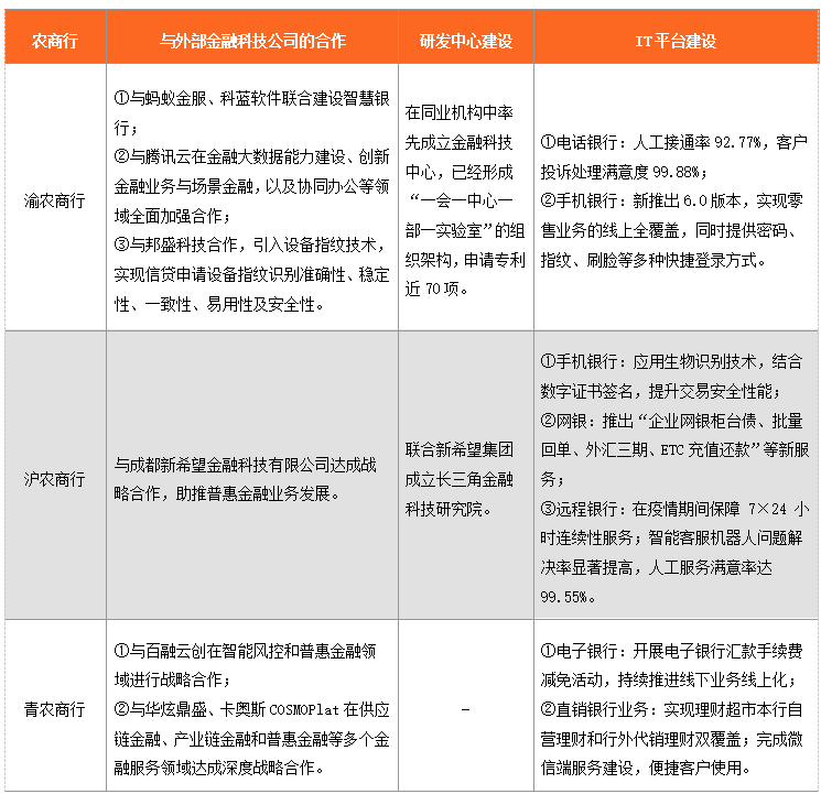 在科技布局上,盡管三家銀行都尚未設立金融科技子公司,但都陸續通過與外部金融科技公司合作來提升自己的科技實力。青島農商行與百融云創和華炫鼎盛簽署了協議,分別在智能風控和供應鏈金融領域進行合作;滬農商行與新希望集團就發展普惠金融達成戰略合作,二者還聯合成立了長三角金融科技研究院,探索大數據、人工智能、云計算和區塊鏈技術在反欺詐、反洗錢等領域的應用;渝農商行則是與螞蟻金服和騰訊等頭部科技企業合作,強化大數據建設、場景金融等多方面的能力。