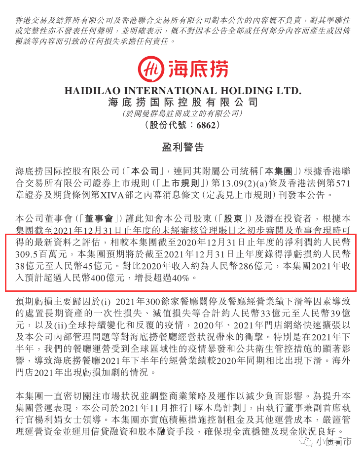 2月21日,海底撈盈利預警顯示,預計2021年將錄得38億-45億元的凈虧損,其中大部分與300多家餐廳關(guān)閉和停業(yè)造成的一次性虧損有關(guān),一次性損失約33億-39億元。