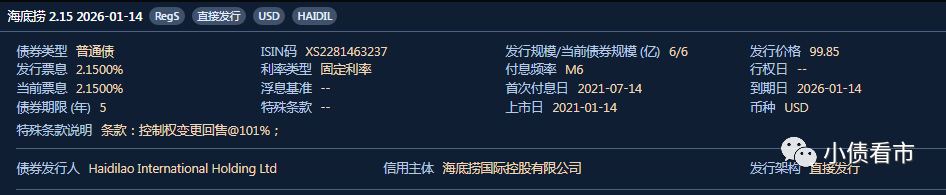 《小債看市》統(tǒng)計,目前海底撈僅存續(xù)上述一只美元債,存續(xù)規(guī)模6億美元,票息2.15%,將于2026年1月14日到期。