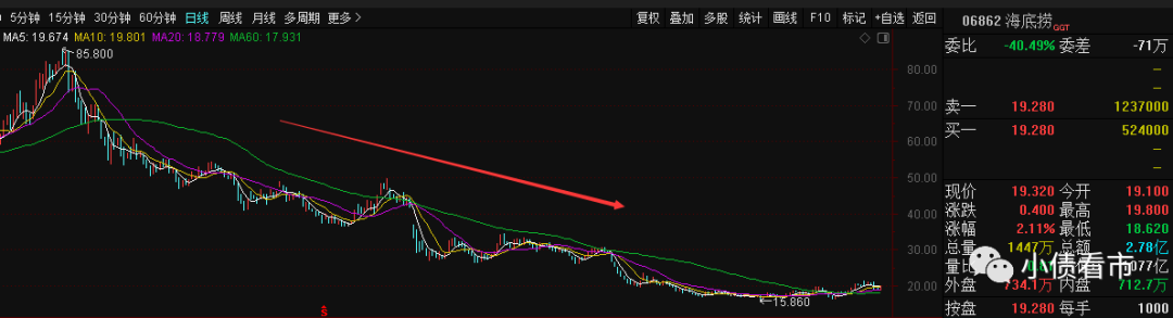 隨著口碑下降,海底撈的股價也開始跌跌不休,由2021年初的85.8港元高位一路下跌至19港元附近,市值縮水近八成,蒸發(fā)約3700億港元。