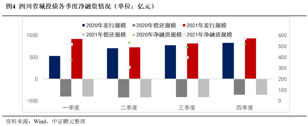 2021年四川城投發(fā)債規(guī)模較2020年有所增加但增速放緩,凈融資額有所下降,同時季度波動明顯