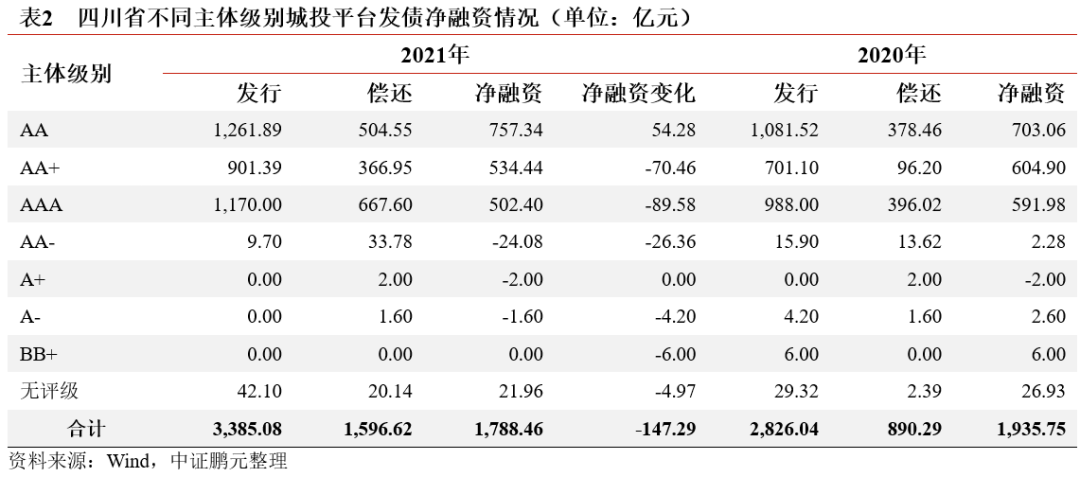 從不同級別的城投公司凈融資規(guī)模來看,2021年四川省AA級別城投凈融資貢獻最多且領(lǐng)先較多,其次是AA+和AAA,凈融資規(guī)模接近。從變動來看,除主體級別為AA的城投公司外,其他不同主體級別的城投公司凈融資同比均有不同程度的下滑。
