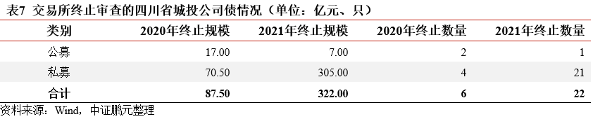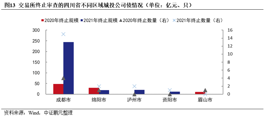 (5)交易所終止項目增長較快,四季度增長最為明顯,以私募債以及成都市城投公司居多。2021年交易所顯示為終止?fàn)顟B(tài)的四川城投公司發(fā)行規(guī)模合計312.00億元,同比增長256.57%,4季度公司債終止項目發(fā)行規(guī)模和數(shù)量達到高峰。2021年私募債以及成都市城投公司終止規(guī)模和數(shù)量較多。