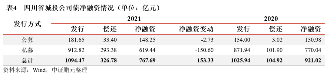 四川省城投公司主要發(fā)行私募債,2021年私募債發(fā)行規(guī)模雖增長但凈融資有所減少,其中成都市、瀘州市、綿陽市發(fā)行規(guī)模較大
