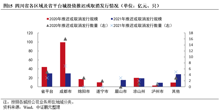 2021年四川省推遲或取消發(fā)行的城投債數(shù)量和規(guī)模較2020年均有下降,但集中在省平臺和成都市,AA主體推遲或取消發(fā)行情況較為多見