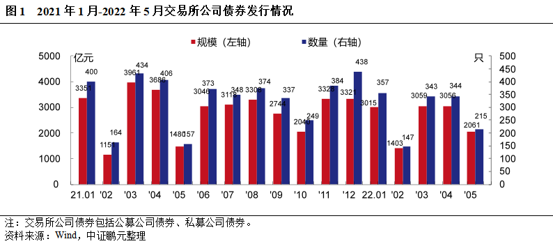2022年5月份,交易所市場共發行信用債券222只,發行規模2,246.27億元,分別環比分別下降39%和32%,同比分別增長38%和49%。具體而言,5月份,公募公司債發行93只、發行規模1,052.00億元,環比分別下降34%和32%,同比分別增長22%和13%;私募公司債發行122只、發行規模1,009.15億元,環比分別下降40%和33%,同比分別增長51%和85%。可交換債和可轉換債方面,5月份可轉債發行數量和發行規模分別環比下降67%和54%,可交換債發行數量和發行規模環比分別下降50%和增長9%。
