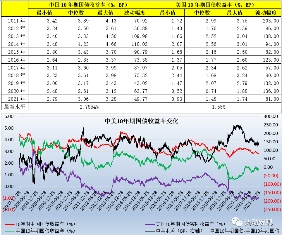 (1)雖然從長周期來看,我國10年期國債收益率的中樞水平為3.50%左右,但是2019-2021年連續三年的歷史中位數分別為3.17%、2.61%和3.06%,均明顯低于3.50%。特別是2021年下半年以來,10年期國債收益率整體上是在3%以下的位置運行,即便按照2019-2021年三年的中樞水平來看(平均為3.05%),2022年的10年期國債收益率中樞水平也有望繼續下移。實際上,若撇開2020年,可以發現2019-2021年的利率中樞水平已經呈現出連續下移的態勢。