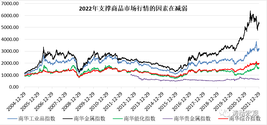 相較于其股債匯市場,商品市場與經濟基本面之間的關聯性更強。大的周期來看,商品市場的這一波牛市行情持續時間較長,主要得益于2015年以來的供給側改革(去產能)+經濟修復階段(對供給收縮與需求修復)的預期強化。但隨著國內經濟基本面的弱化、海外生產的修復以及政策層面對炒作大宗商品的打壓,我們認為支撐2022年行情大宗商品的因素有所減弱,需要做好心理準備。