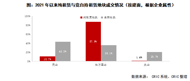住房租賃回報率偏低,不足以吸引社會資金大規模投入,因此當前租賃市場主要由“國家隊”托底。租賃用地主要3種供地方式:純租賃地塊、競自持租賃地塊和集體用地(涉及存量,暫不討論)。純租賃地塊因折價較多,大部分都由當地政府以底價定向轉讓予地方國企,如CRIC系統顯示年內87.9%的純租賃地塊由地方國企斬獲。而競自持租賃地塊方面,目前約56.7%的競自持租賃用地由國資獲取,而民企或主動或被動選擇,仍取得其中的43.3%,多為龍湖、旭輝、中駿等涉及住房租賃的主流房企。