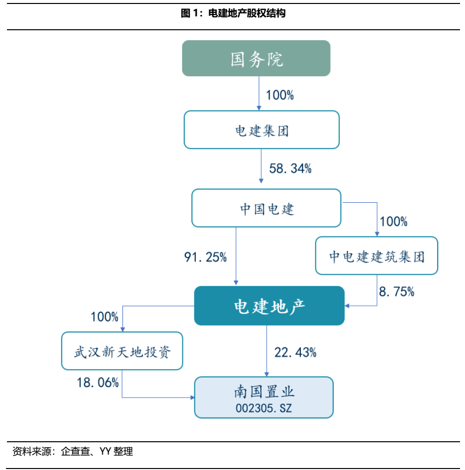 2005年11月,作為首批獲得國資委核定的16家主營房地產(chǎn)開發(fā)與經(jīng)營業(yè)務的央企,中國電建地產(chǎn)集團有限公司(以下簡稱“電建地產(chǎn)”)重組成立。電建地產(chǎn)是中國電力建設(shè)股份有限公司(以下簡稱“中國電建”)房地產(chǎn)業(yè)務的核心子公司,國資委通過中國電力建設(shè)集團有限公司(以下簡稱“電建集團”)間接持有電建地產(chǎn)58.34%的股份,為公司實際控制人。電建地產(chǎn)旗下持有上市公司南國置業(yè)股份有限公司(以下簡稱“南國置業(yè)”)。
