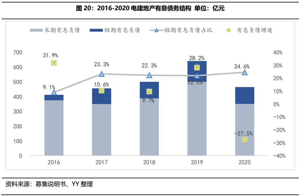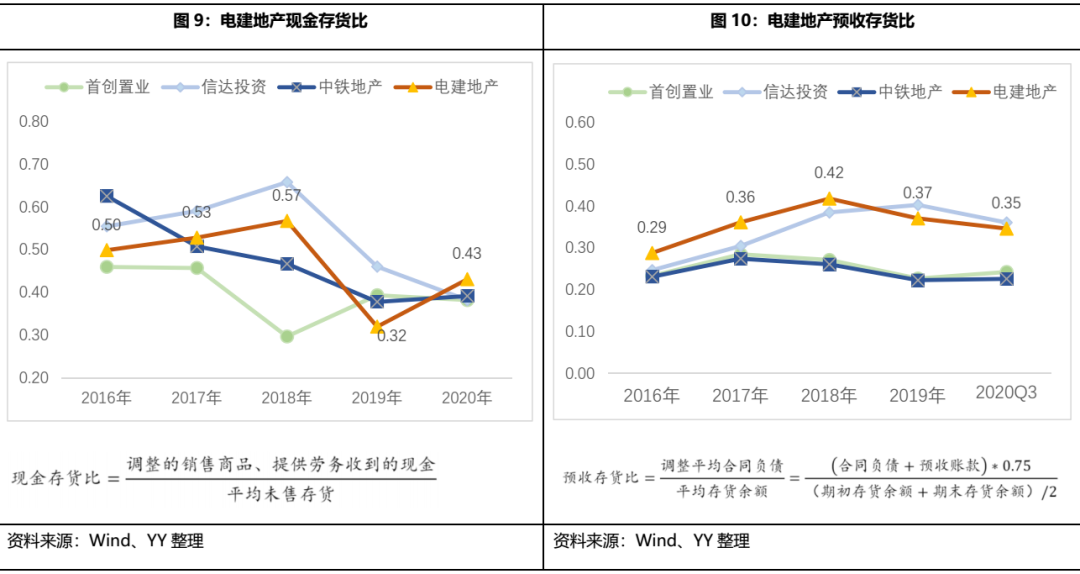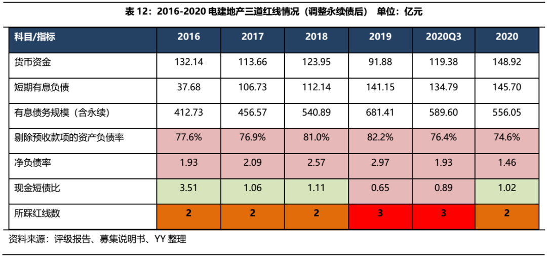 2015-2019年,電建地產(chǎn)有息債務規(guī)模持續(xù)膨脹,若將永續(xù)債納入有息負債范疇,2019年末有息債務達到681.41億元,現(xiàn)金短債比也轉(zhuǎn)紅,三條紅線均觸線,年末凈負債率為1.03,現(xiàn)金短債比為1.02,剔預負債率和凈負債率雖有所改善,但2020年底仍踩兩條紅線,現(xiàn)金短債比也在觸線邊緣徘徊,暫為橙檔企業(yè)。