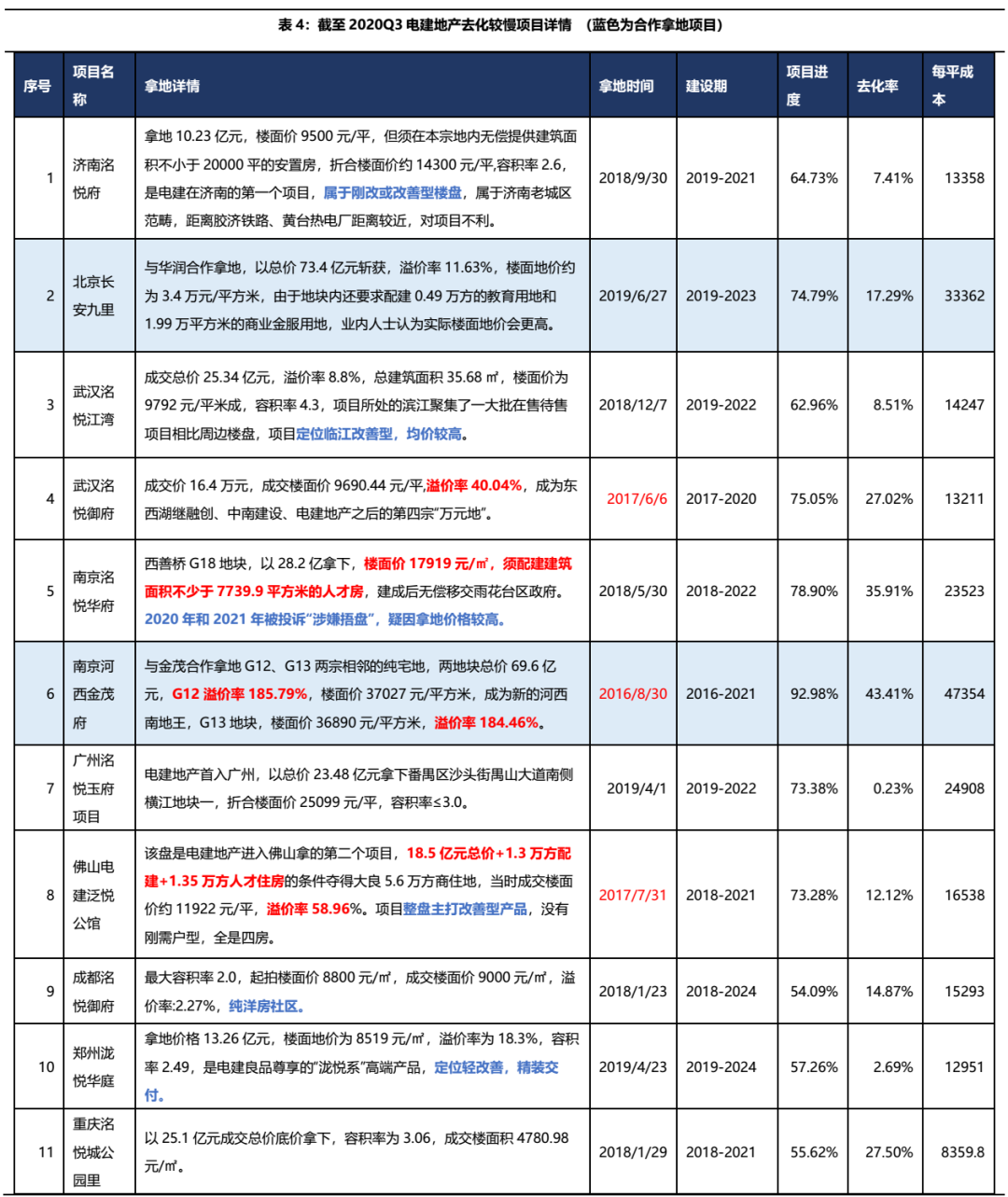 具體來看去化較慢的項目,公司不乏高溢價拿地項目,尤其是在2016-2017年拿地價格普遍較高(序號4、6、8),南京洺悅?cè)A府更是兩度被投訴“涉嫌捂地”。此外,去化不暢的部分項目主打住房改善或型產(chǎn)品,均價較高。整體看來,拿地成本高+產(chǎn)品定位輕改善,是公司住宅項目去化慢的重要原因,未來大規(guī)模的存貨去化將使公司面臨挑戰(zhàn)。