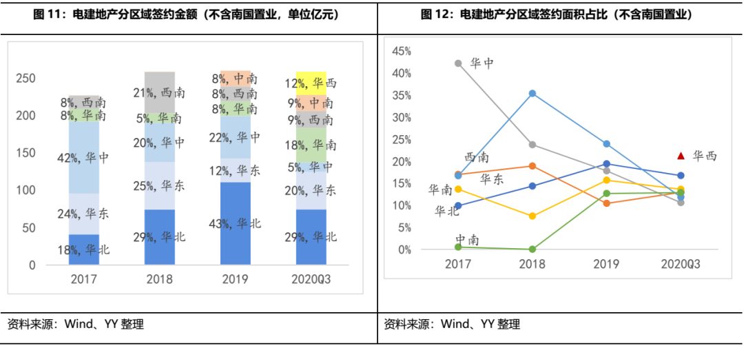 公司近四年簽約銷售金額增長較為平緩,銷售區(qū)域分布朝著“全國范圍內(nèi)更加合理均衡的戰(zhàn)略布局”調(diào)整。截至2020Q3,簽約金額占比較高的區(qū)域為華北29%、華東20%和華南18%,簽約面積貢獻較多的是華西21%、華北17%和華南14%,整體區(qū)域集中度較低,能夠較好的分散區(qū)域政策風險。