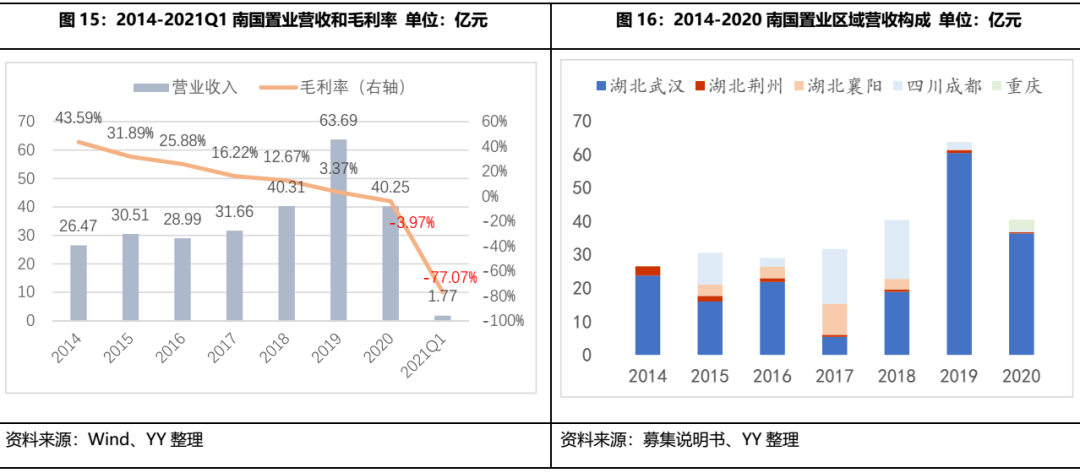 南國置業(yè)自2014年起營收規(guī)模有所增長,但盈利能力持續(xù)下跌,并購后業(yè)務開展不暢,疫情打擊雪上加霜。如圖16,被吸并之后南國置業(yè)的毛利率一路下探,2019年毛利率已經(jīng)低至3.37%,業(yè)務收入在2014-2018年也只能算是平緩增長,2019年營收沖高,但從盈利情況看業(yè)務擴張并不順利,而2016-2019年武漢市房價處于加速上升期,顯然南國置業(yè)的經(jīng)營層面出現(xiàn)了問題,而在新冠疫情的沖擊下,重倉武漢的南國置業(yè)2020年更是慘淡。