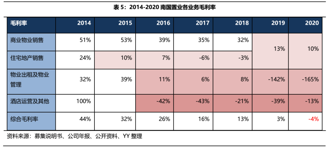 分別考察各業(yè)務板塊毛利率,發(fā)現(xiàn)公司的商業(yè)物業(yè)銷售業(yè)務運作整體比較健康,但營收占比較大的住宅地產(chǎn)銷售連年保持低毛利,物業(yè)出租和酒店運營雖然收入貢獻有限,但虧損更為嚴重。