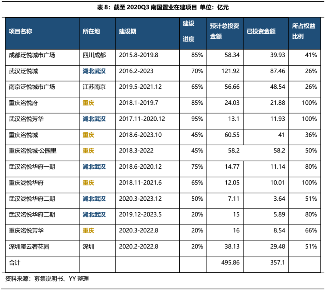 截至 2020 年 9 月底,南國置業(yè)現(xiàn)有在建項目共13個,主要集中在武漢(5個)、重慶(5個)等城市,區(qū)域集中度仍然很高;從權(quán)益占比來看,公司開始加大合作拿地力度,也在尋找新的突破路徑;依據(jù)所占權(quán)益比例,六個項目剩余擬投資金額敞口共計 62.54 億元。