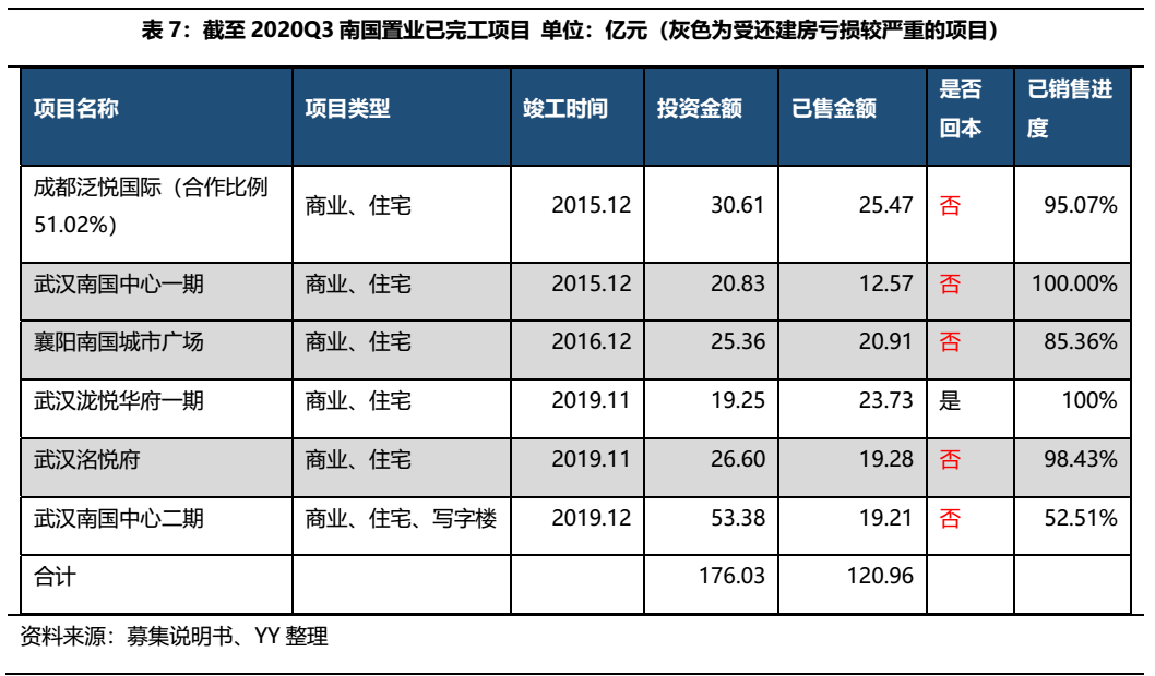截至2020年9月底,南國置業(yè)公布的6個已完工項目,4個項目在武漢,其中5個項目均未收回投資成本,以當前的銷售金額和進度來看,即使未售罄項目售完也很難覆蓋投資金額,六個項目已投資累計176.03億元,已售金額僅累計120.96億元。