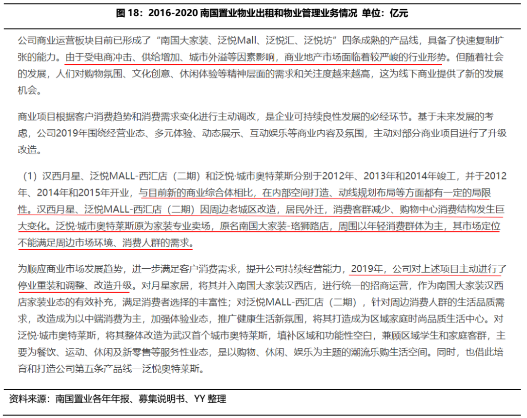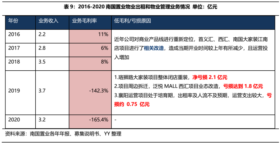 物業(yè)出售業(yè)務方面,2016-2019年公司對旗下商業(yè)產(chǎn)品線進行了大規(guī)模的改造,期間內(nèi)物業(yè)出售及物業(yè)管理板塊的毛利率一直很低。2019年公司披露珞獅路大家裝項目、泛悅MALL西匯項目主要改造項目虧損合計3.9億元,而當年物業(yè)出租板塊業(yè)務收入僅為3.7億元,業(yè)態(tài)調(diào)整確實為虧損的直接原因,而2020年在疫情的沖擊更是雪上加霜。