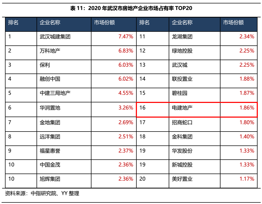 從市場競爭格局來看,2020年武漢城建集團、萬科和保利市場占有率位居前三,而電建地產(chǎn)排名第16位,市場份額為1.86%。在全面壓降住宅容積率、樓市競爭不斷加劇、政策由寬從嚴的大背景下,面對連續(xù)兩年的業(yè)績大幅下挫,南國置業(yè)未來想在大本營武漢保有一席之地也并非易事。