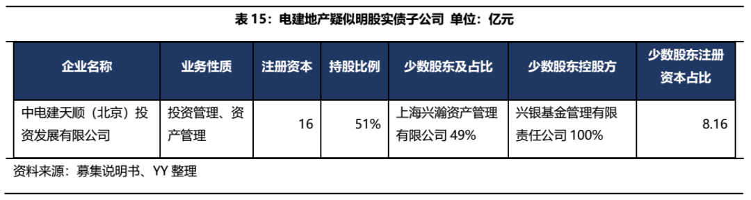 截至2020Q3,電建集團納入合并報表范圍的一級子公司共計 49 家,其中非全資子公司 25 家,截至2020年末,南國置業(yè)納入合并子公司29家,其中非全資子公司13家,通過查找少數(shù)股東,僅發(fā)現(xiàn)中電建天順(北京)投資發(fā)展有限公司疑似存在明股實債,少數(shù)股東控股方為興銀基金,少數(shù)股東注冊資本為8.16億元。