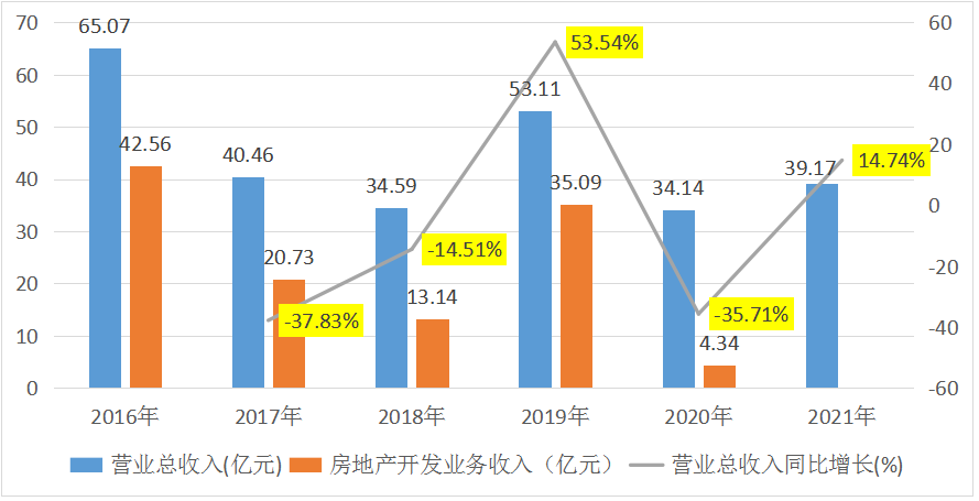 2021年,中新集團年報不再顯示房地產開發業務的情況,且實現營業總收入39.2億元,同比增長14.7%,穩中有進,發展態勢良好。