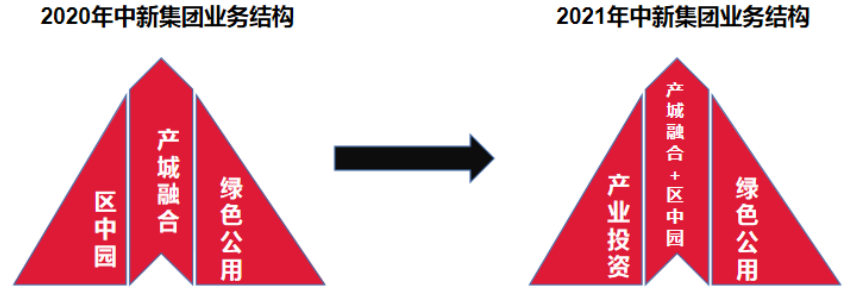 2019年中新集團成功上市后,公司開始改變業務結構,提高公司核心競爭力。2021年中新集團將原兩翼板塊之一的區中園業務納入主體板塊范疇;將產業投資從園區開發運營的一個業務節點提檔升級為兩翼支撐板塊的重要一翼,形成產城融合、區中園為主體、以產業投資和綠色公用為兩翼支撐板塊的新發展格局。