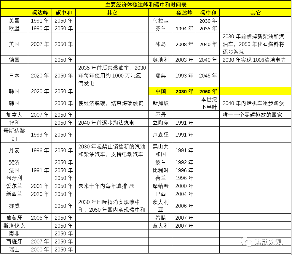 2、雖然中國設定的碳達峰和碳中和時間進度落后于其它主要經濟體(大部分經濟體在2050年及之前實現碳中和目標),但是我國碳達峰和碳中和之間僅相隔30年,較其它經濟體普遍在40年以上來說,我國緩和的時間比較窄。
