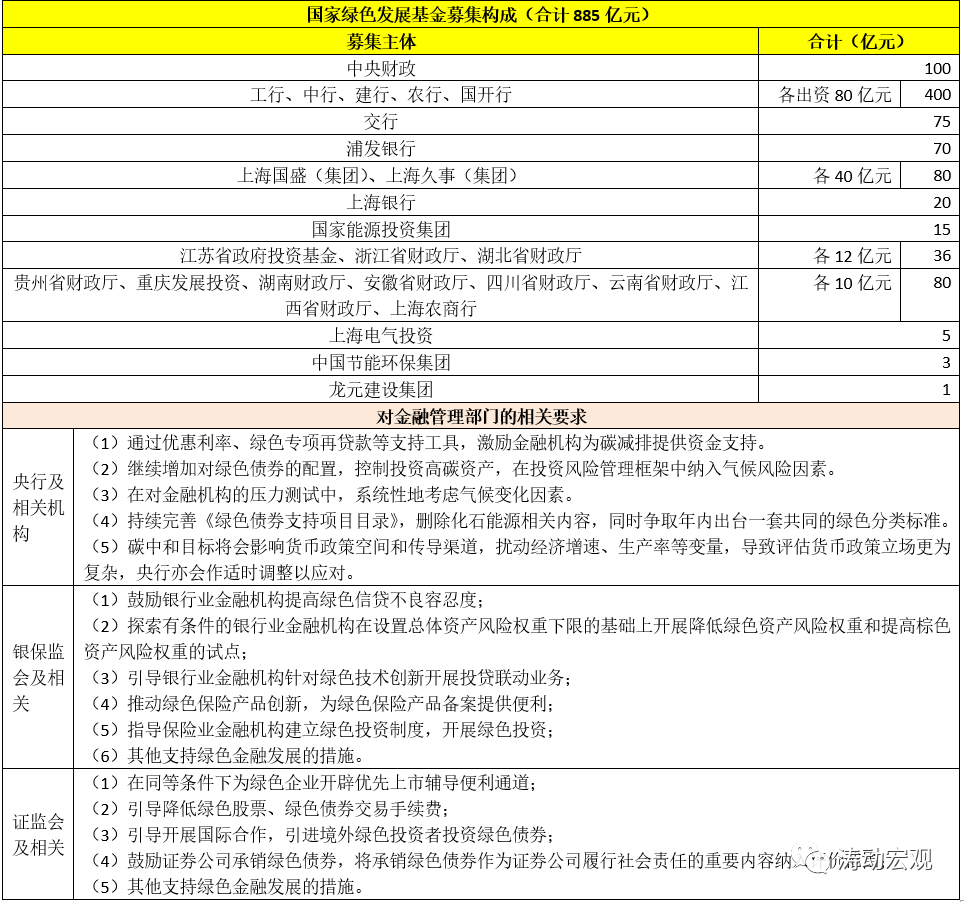 (1)中央財政整合現有節能環保等專項資金設立國家綠色發展基金,鼓勵有條件的地方政府和社會資本共同發起區域性綠色發展基金,支持社會資本和國際資本設立各類民間綠色投資基金。