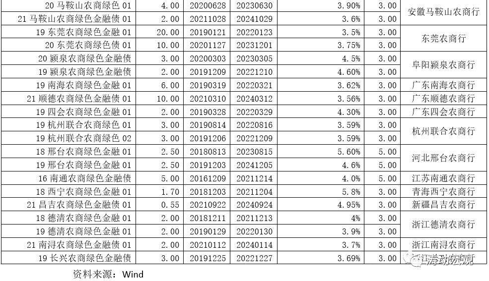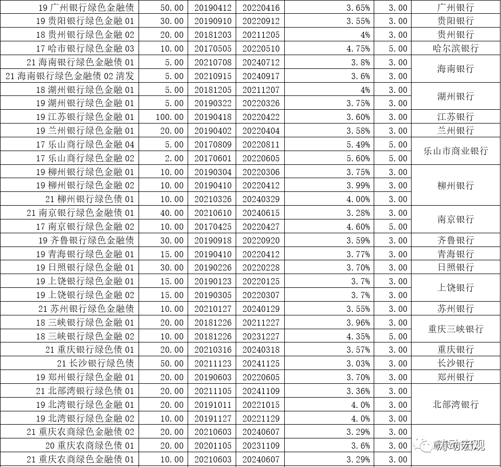 (2)目前股份行中有3家銀行有存續綠色金融債(分別為興業銀行、華夏銀行和浙商銀行);城商行中有24家銀行有存續、農商行中有15家銀行有存續;全國性銀行僅1家有存續(工行);非銀金融機構有7家有存續,且均為金融租賃公司,分別為江蘇金融租賃、華融金融租賃、農銀金融租賃、浦銀金融租賃、蘇銀金融租賃、興業金融租賃和長城國興金融租賃。