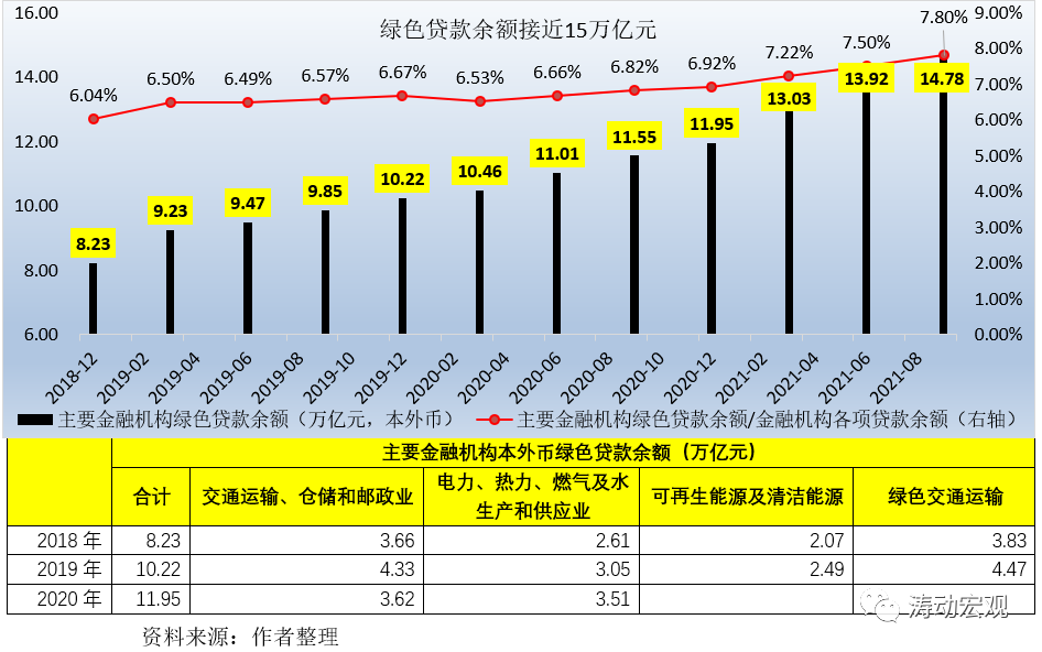 目前直接融資市場能夠給予綠色金融領域的支持力度明顯不夠,綠色債券規模剛剛超過1.50萬億元,因此綠色信貸仍是綠色金融的主力。截至2021年9月底,金融機構綠色貸款余額達到14.78萬億(目前這一數值居全球第一位),占全部貸款的比例達到7.80%,從數值上看在金融機構各項貸款中的比例趨勢提升。