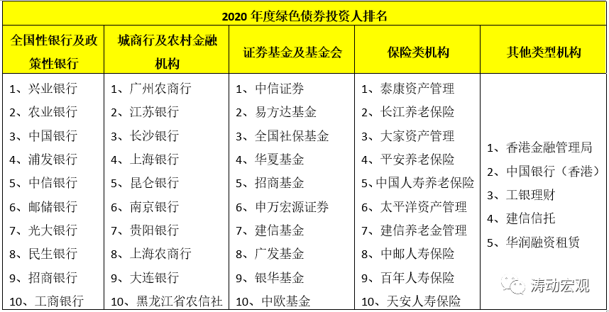 2021年1月12日,交易商協會在其官方微信號上公示了2020年度綠色債券投資人排名(根據投資人參與綠色債務融資工具的投資程度)??梢钥闯?,全國性銀行中興業銀行、農業銀行、中國銀行、浦發銀行和中信銀行排名前五,城商行及農村金融機構中廣州農商行、江蘇銀行、長沙銀行、上海銀行和昆侖銀行位居前五,其它如理財公司等亦有參與。