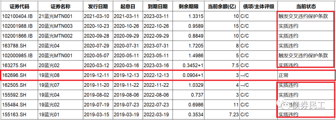 藍光發(fā)展目前國內(nèi)信用債券市場存續(xù)債券11只,存續(xù)金額83.73億元,存存續(xù)債券產(chǎn)品包括中期票據(jù)、小公募和私募債。目前,藍光發(fā)展的存續(xù)債券除“19藍光08”為正常存續(xù)外,其余債券均已處于實質(zhì)違約或者處罰交叉違約保護條款,具體債券明細詳見下圖: