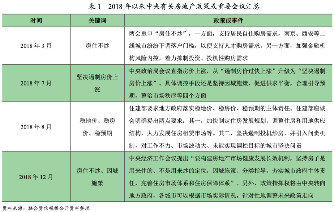 中央層面,自2016年“十一”地產(chǎn)調控政策周期開始,2016年12月的中央經(jīng)濟工作會議首提房住不炒,2017年3月地產(chǎn)調控政策進一步升級,呈現(xiàn)了熱點城市政策出臺高頻次、調控城市覆蓋范圍廣、政策措施多維度等特征。2018年,在金融財政政策定向“寬松”的同時,房地產(chǎn)調控政策仍然“從緊”,繼續(xù)堅持“住房不炒”、逐步建立穩(wěn)定房地產(chǎn)市場長效機制的調控思路,具體內(nèi)容詳見表1。