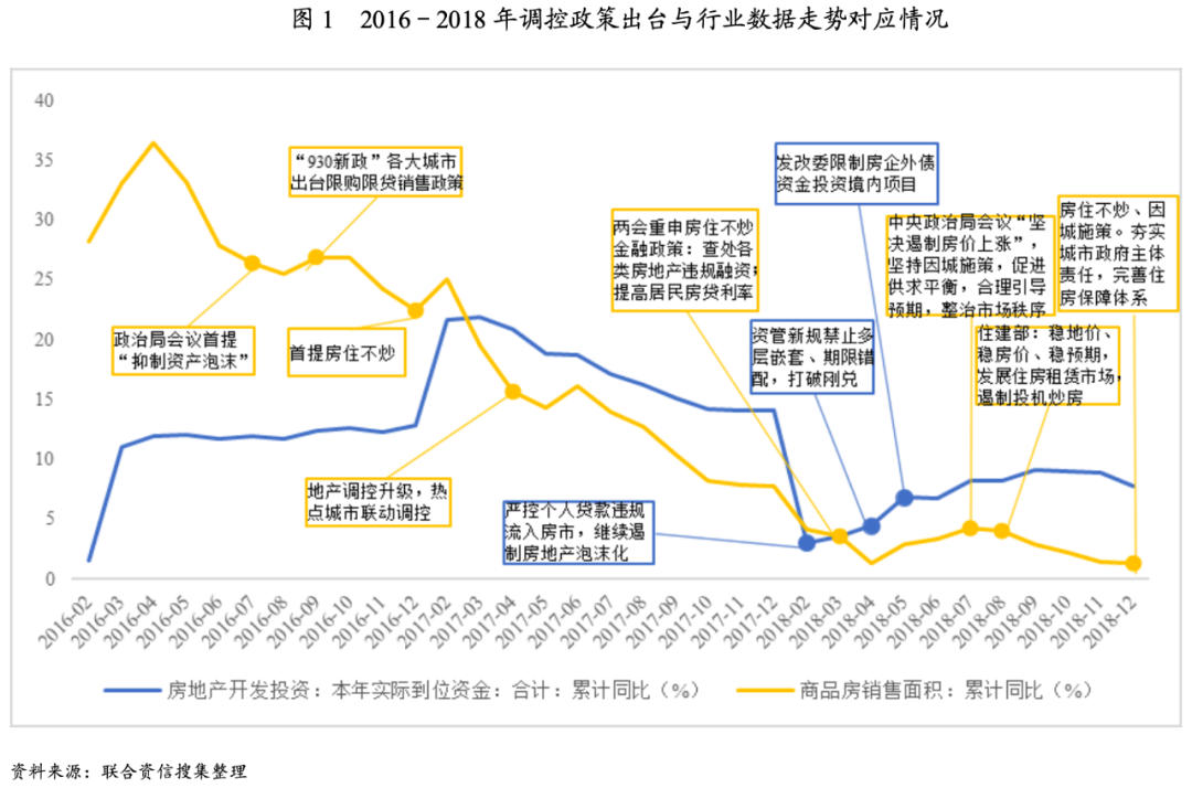 自2016年下半年開始,房地產(chǎn)行業(yè)銷售數(shù)據(jù)與需求端的調控政策緊密相關,隨著調控的頻繁出臺銷售數(shù)據(jù)呈明顯下滑且自2018年開始持續(xù)地位徘徊;房地產(chǎn)開發(fā)投資本年實際到位資金與融資端/個人貸款端政策關聯(lián)度高,2018年初開始呈現(xiàn)斷崖式下滑,具體政策時點與行業(yè)數(shù)據(jù)走勢對應情況如圖1所示,第一波行業(yè)加壓正式來臨。
