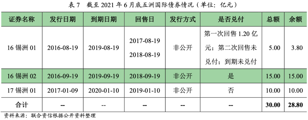 五洲國際以商業(yè)地產(chǎn)開發(fā)為主業(yè),電商的快速發(fā)展對商貿(mào)城業(yè)務模式形成明顯沖擊、房地產(chǎn)行業(yè)政策持續(xù)收緊亦使其外部環(huán)境惡化;項目區(qū)域分布較差及項目自身開發(fā)周期長使得去化放緩,經(jīng)營性現(xiàn)金流持續(xù)為凈流出;疊加承債式發(fā)展使得債務規(guī)模持續(xù)增長且短期債務規(guī)模較大,資金鏈緊張,最終導致債務違約。“16錫洲01”未于2018年8月19日償付回售的本金和利息,五洲國際構成了實質性違約,其后15億元的“16錫洲02”和10億元“17錫洲01”相繼違約,截至2021年6月底,五洲國際違約金額共計28.80億元。