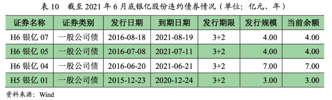 截至2021年6月底,銀億股份存續(xù)4只債券均已發(fā)生實質性違約,累計金額18.00億元。債券均設有回售條款,其中“H5銀億01”在回售日(2018年12月24日)因無法按時兌付本息發(fā)生實質性違約,后其他存量債券相繼發(fā)生違約。