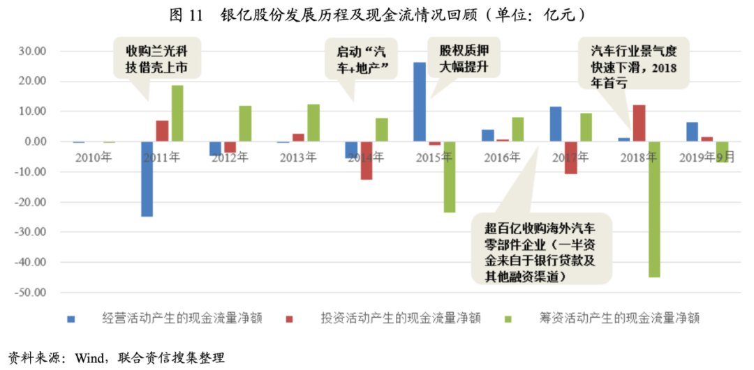 我們將銀億股份戰(zhàn)略轉型的時間節(jié)點和現(xiàn)金流情況進行對比,回顧其發(fā)展歷程我們可以發(fā)現(xiàn):公司自2014年開始啟動“汽車+地產(chǎn)”的多元化策略,2015年開始進行大量股權質押以應對2016年開始的大額海外汽車零部件企業(yè)收并購舉動;但公司錯過了地產(chǎn)的快速發(fā)展期,并在大額投入后迎來了汽車行業(yè)的快速下滑,并于2018年出現(xiàn)首虧,當年融資能力快速下滑,爆發(fā)債務違約危機,具體情況如下圖所示。