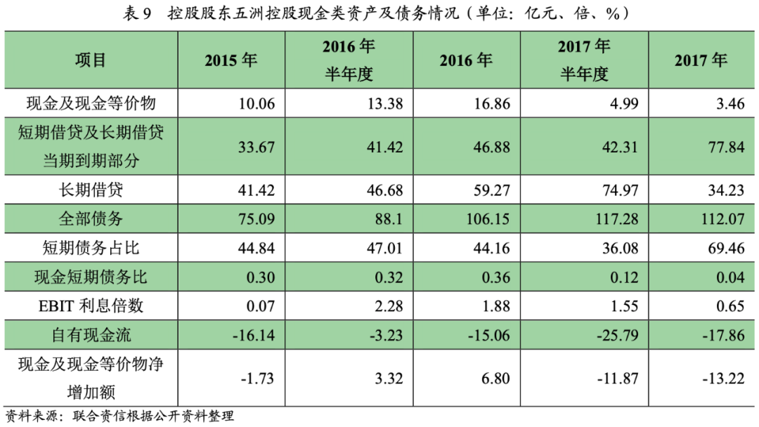 2018年7月5日,五洲控股已發(fā)生債務違約,控股股東雖然為五洲國際債務提供擔保,但自身收入下滑,盈利虧損,經(jīng)營活動現(xiàn)金流量凈額持續(xù)為負,自身償債能力不足,對五洲國際債務已無擔保能力。