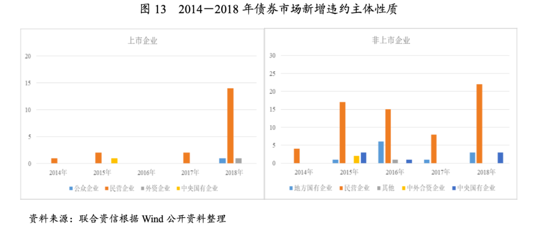 2014-2018年,非上市違約主體共87家,以民營企業(yè)為主,地方國有企業(yè)和中央國有企業(yè)也存在違約現(xiàn)象;上市主體的違約數(shù)量遠低于非上市主體,其中2018年上市主體違約數(shù)量16家,遠超以前年度,主要系2018年A股市場大幅下跌,且部分上市公司股票質押比例過高,面臨爆倉風險,影響再融資能力所致。