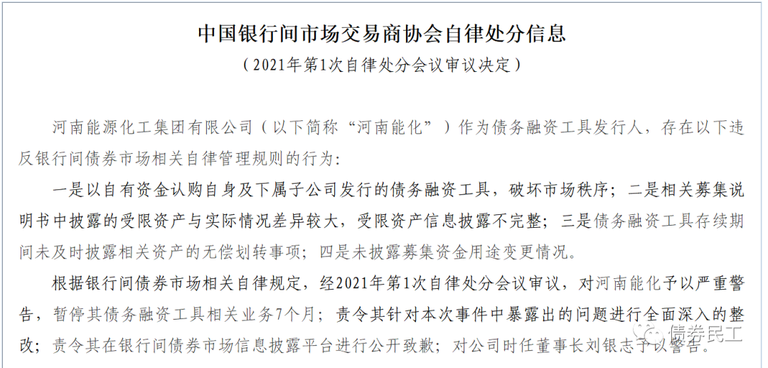 永煤集團的控股股東河南能源化工集團有限公司被交易商協(xié)會予以嚴重警告,暫停債務(wù)融資工具相關(guān)業(yè)務(wù)7個月。