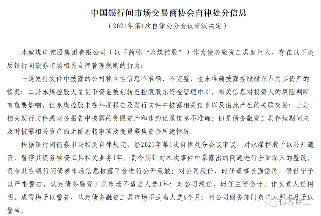 2020年11月10日,永煤集團電發(fā)行的“20永煤SCP003”意外違約,在信用債券市場上引發(fā)了極大的關(guān)注。永煤集團及相關(guān)中介機構(gòu)相繼收到了監(jiān)管機構(gòu)的處分。在上海證券交易所的此次紀律處分之前的2021年1月14日,交易商協(xié)會對永煤集團予以公開譴責(zé),暫停其債務(wù)融資工具相關(guān)業(yè)務(wù)1年。
