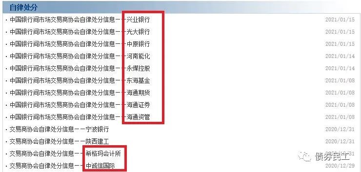 永煤集團債券違約之后,不止讓永煤集團和河南能化被交易商協(xié)會的嚴厲處分,引發(fā)了交易商協(xié)會對1家會計師事務(wù)所(希格瑪會計師事務(wù)所)、1家評級機構(gòu)(中誠信評級)、7家金融機構(gòu)(海通證券、海通期貨、海通證券資管、東?;?、興業(yè)銀行、光大銀行、中原銀行)的自律處分。這么大的自律處分力度在信用債券歷史上絕無僅有,康美藥業(yè)和康得新等影響較大的違約發(fā)行人也沒有這個待遇。打開交易商協(xié)會的自律處分頁面,直接被永煤事件的相關(guān)機構(gòu)自律處分情況刷屏。