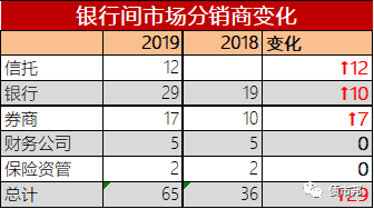 從數量上來看,2019年具有參團分銷資格的市場成員,從2018年初的36家快速上升到65家,其中信托公司和銀行成為新增主力,分別達到12家和10家。