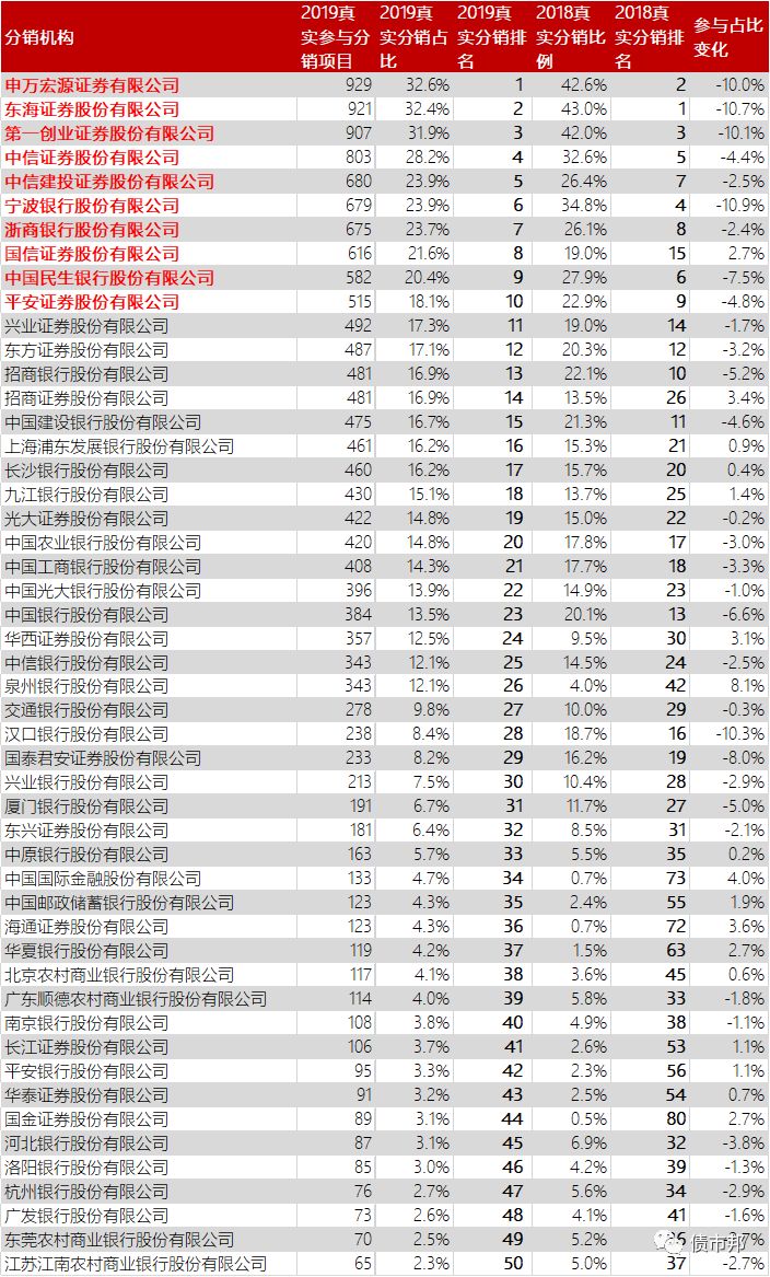 同樣按照去除主承項目之后參與的分銷項目個數作為真實參與分銷項目情況,與2018年全年情況對比如下表所示: