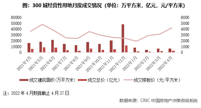 截至4月27日,全國300城經營性土地4月總成交建筑面積僅6537萬平方米,同比降幅近六成,成交規模仍處于歷史地位水平。但是受到杭州、寧波、南京、天津等城市首輪集中土拍的影響,成交單價結構性上漲,平均樓板價增至4210元/平方米,環比漲幅突出,高達34%,同時也帶動成交溢價率環比微增,較上月上漲了0.3個百分點至4.8%。