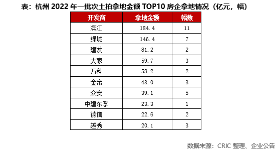 值得一提的是,杭州土拍中,民企表現相對積極:濱江、綠城、眾安、德信等多家房企均報名參拍了多宗土地,尤其是濱江在首輪供地中拿下了11幅地塊,拿地金額超過180億元,綠城也競得7宗地塊,總金額接近150億。也體現了此類房企對于杭州市場前景的肯定,以及對區域深耕戰略的堅持。
